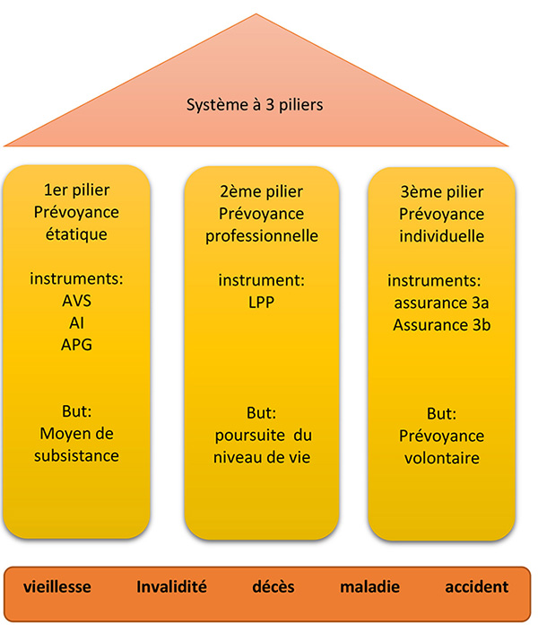 Notre système d’assurance est basé sur un système à 3 piliers. Ce système vise à assurer une protection pour un niveau de vie décente dans la vieillesse, en cas d'invalidité, maladie et accident. Il assure également la sécurité financière des proches en cas de décès de l'assuré.
